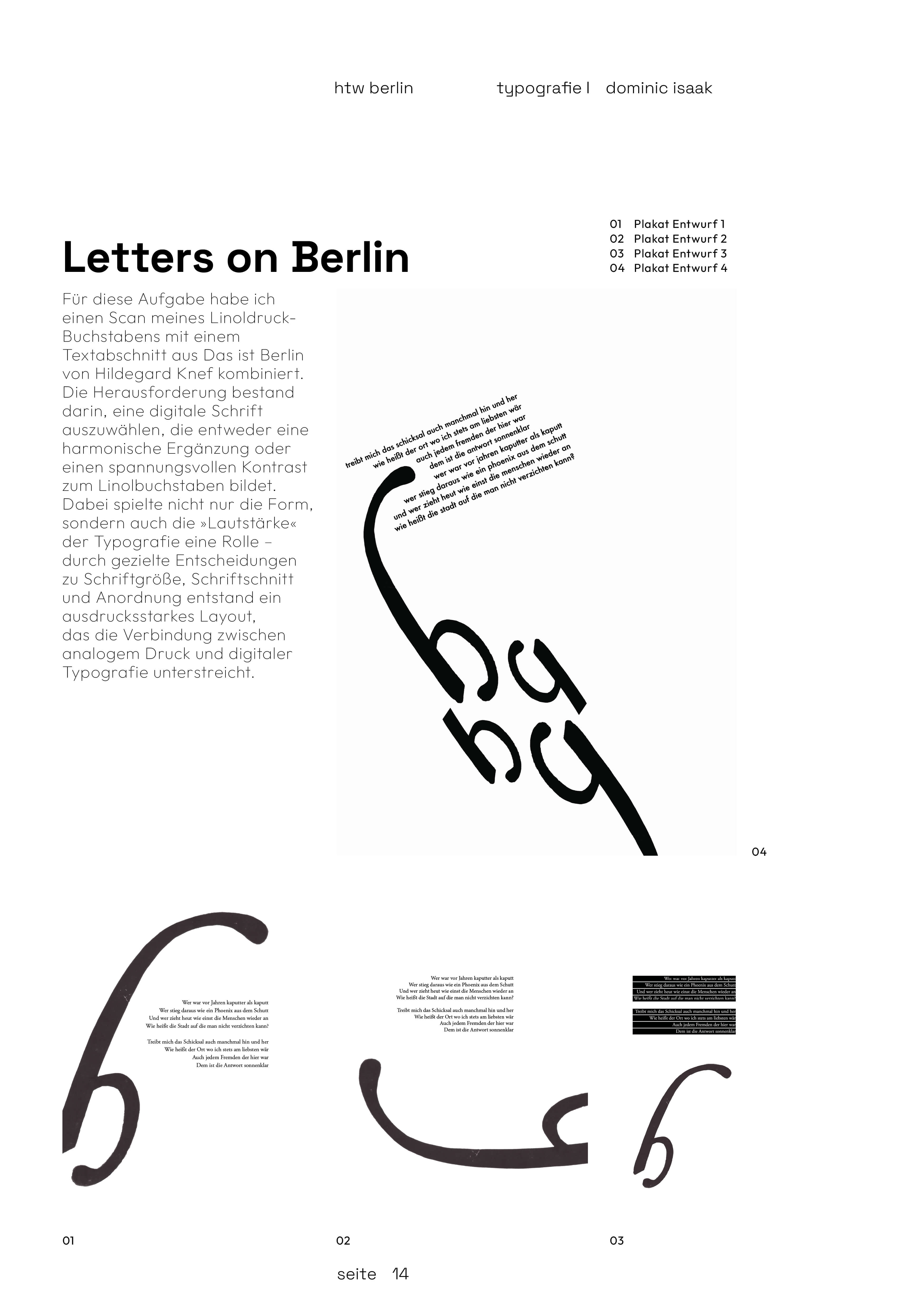 Hier wird meine gestalterische Auseinandersetzung mit Typografie im Rahmen des Kurses Typografie I der HTW Berlin gezeigt. Durch verschiedene analoge und digitale Übungen wurden grundlegende typografische Prinzipien wie Form, Rhythmus, Weißraum und Komposition erforscht. Die Aufgaben umfassten experimentelle Schreib- und Drucktechniken, das Zeichnen und Spationieren von Buchstaben sowie die Entwicklung individueller typografischer Lösungen. Ziel war es, ein vertieftes Verständnis für die Wirkung und Funktion von Schrift zu entwickeln und handwerkliche sowie gestalterische Fertigkeiten in der Typografie zu schärfen.